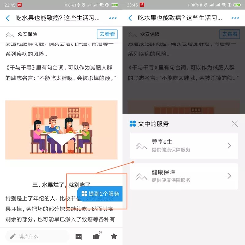 比如,众安保险生活号最近推文《吃水果也能致癌?这些生活习惯要注意》,通过介绍健康饮食的知识来传达对健康的重视,而文章旁边就会挂载相关的保险小程序进行转化。