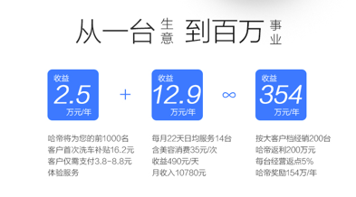 不仅如此,此次众筹,哈帝还针对首批众筹用户推出了“从一台到百万”的扶持计划,通过强大的补贴政策、客户引流等实际性措施,帮助用户培育本地化市场,实现投入3万获得年入百万甚至更高的商业回报。比如前1000名客户首次洗车可获得补贴16.2元,客户实际只需支付3.8-8.8元就可享受更为优质的洗车等体验,大大降低创业早期获客成本过高等难题。