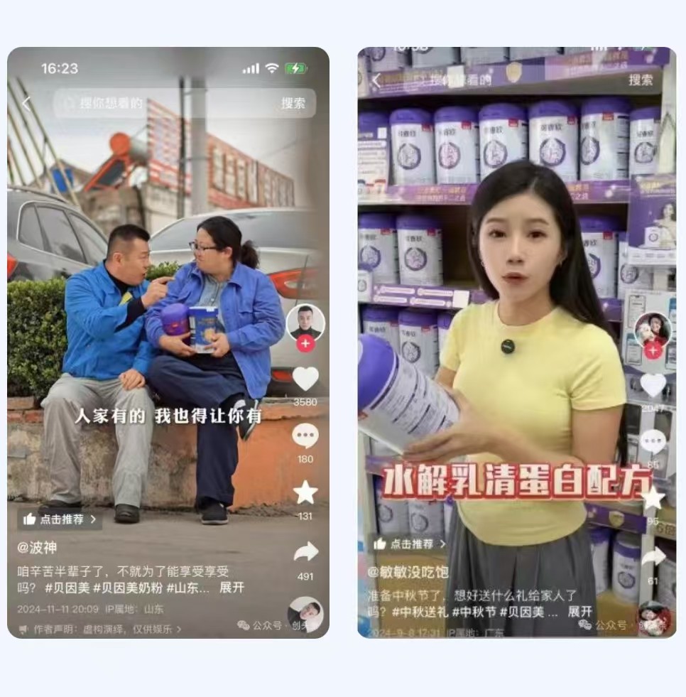 例如,达人波神在双11期间,以一对中年夫妻为贝因美奶粉店送货为主线,融入幽默搞笑元素,讲述夫妻间的爱情故事,视频结尾的反转情节成功引发粉丝共鸣。达人敏敏没吃饱则在中秋节以“探店种草”为切入点,从姐姐生孩子挑选礼物延伸至母婴店与儿童奶粉,再巧妙关联全家营养奶粉与中秋送礼场景。